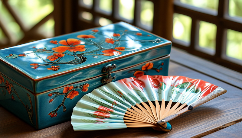 Ремесленные сувениры — лакированные шкатулки, керамика, веера.